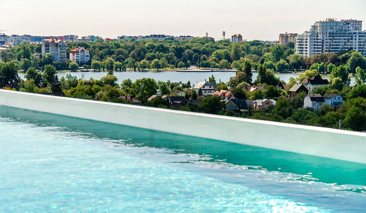 Справжньою окрасою комплексу стали перший у місті басейн на даху із неймовірними краєвидами та стильні тераси, де облаштовані зони для барбекю та відпочинку.
