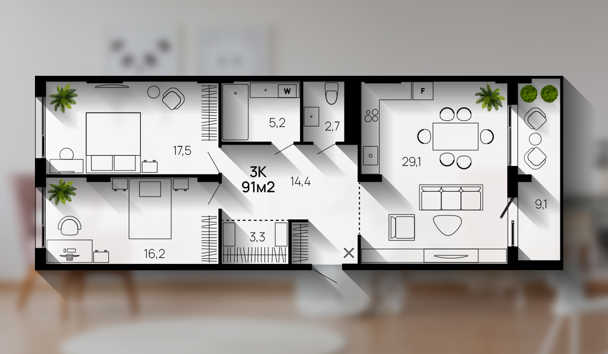 Приклад планування квартири з просторою дитячою кімнатою у житловому районі Manhattan UP: