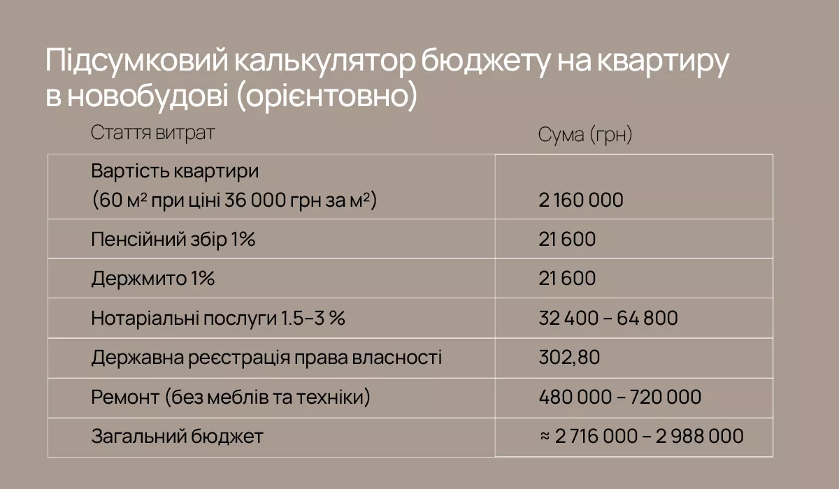 Крім базової суми (вартість квадратних метрів), при купівлі житла потрібно запланувати додаткові платежі (розраховано на квартиру вартістю 2 млн 160 тис. грн):