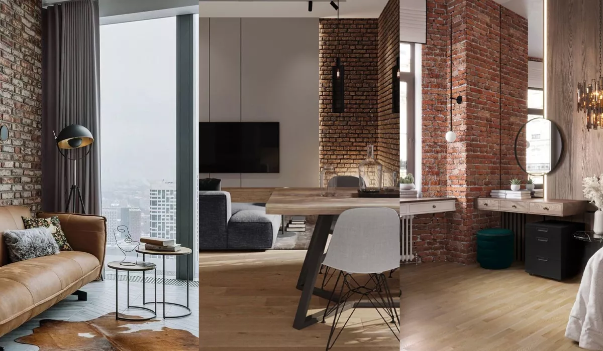 Найпопулярніший акцент – цегляна стіна. Замість повноцінної кладки використовують гіпсові або керамічні панелі, декоративні шпалери чи тонкий клінкер, облицювальну плитку з випаленої глини, яка візуально майже не відрізняється від справжньої цегли, але значно легша, міцна та проста в монтажі. Такі рішення не дорогі, не навантажують перекриття й підходять навіть для лофту у маленькій квартирі.