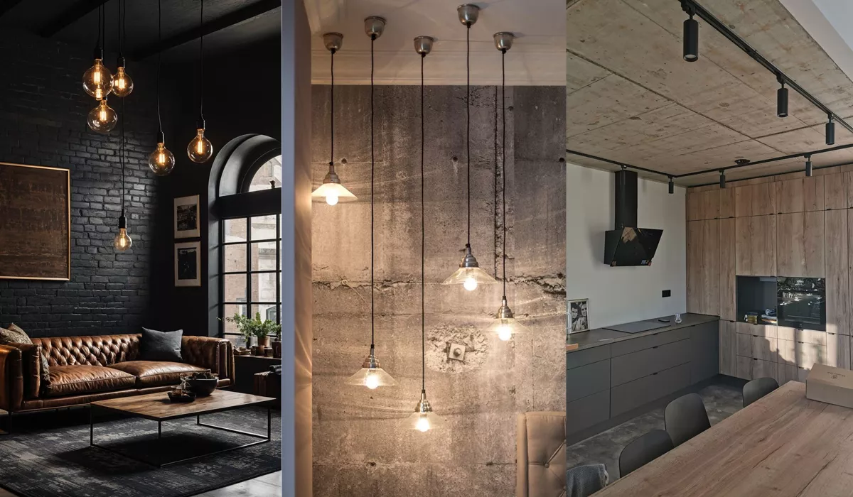 Класичний елемент стилю – лампочки Едісона з видимою ниткою розжарювання. Вони додають атмосферності та добре працюють як у зоні кухні, так і над обіднім столом чи у вітальні. Також популярні люстри-павуки з кількома проводами, що розходяться від однієї точки. Це ефектне й водночас бюджетне рішення для індустріального стилю в новобудові.