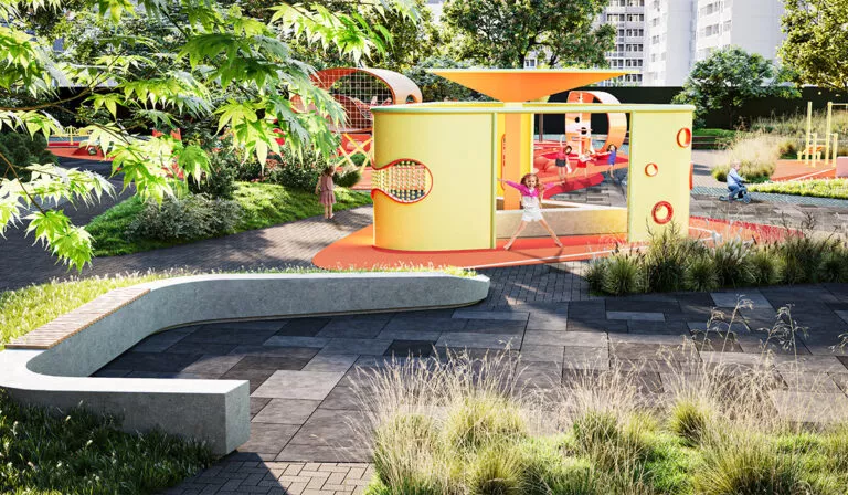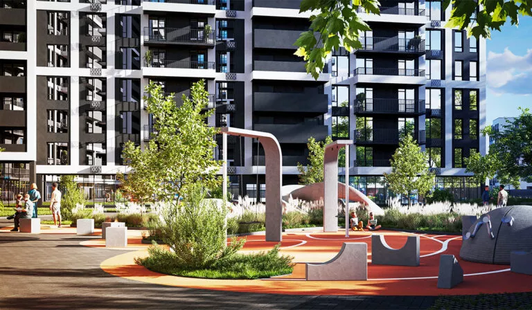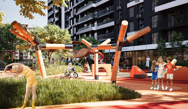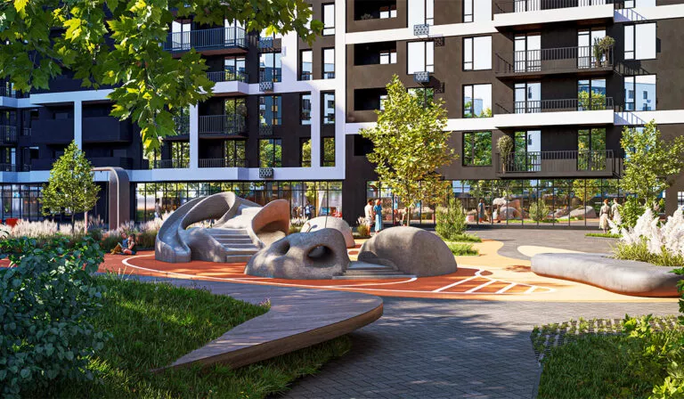 На території передбачені яскраві дитячі майданчики з безпечним покриттям та сучасним обладнанням.